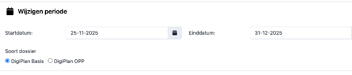 Bij het aanmaken van het nieuwe DigiPlan heb je de start- en einddatum al bepaald. Vervolgens kun je de looptijd in periodes opdelen. Voor elke periode kun je bepalen of je gebruik gaat maken van DigiPlan Basis of DigiPlan OPP. Het bepalen van ...