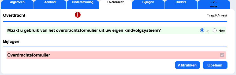 Dit tabblad begint met de vraag of je voor de overdracht gebruik wilt maken van het overdrachtsformulier uit het eigen kindvolgysteem. Wil je dit, selecteer dan de optie 'Ja' en druk op de blauwe knop Opslaan;