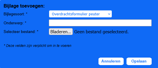 Onderstaand scherm verschijnt. Kies de gewenste bijlagesoort, vul bij onderwerp de naam/titel van de bijlage in en druk op de grijze knop Bladeren. Als je bij het tabblad Overdracht hebt gekozen voor het eigen formulier, dan kies je bij bijlagesoort altijd voor 'Overdrachtsformulier peuter'. Je kunt vervolgens in je eigen laptop/pc het betreffende bestand opzoeken en selecteren. Sluit af met Opslaan;